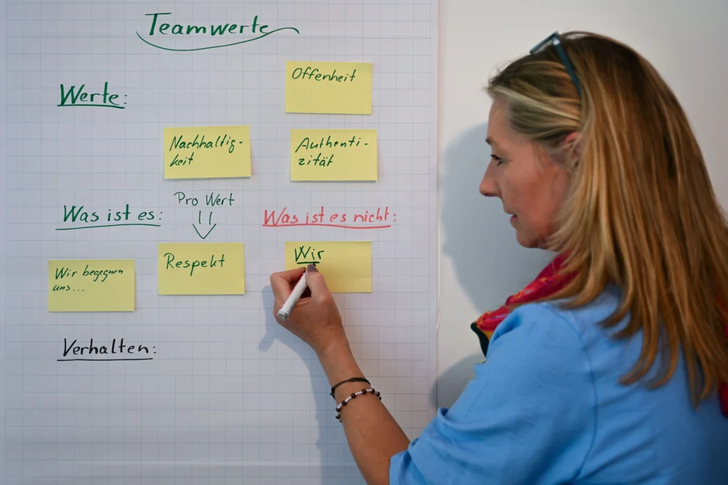 Gemeinsame Werte schaffen Orientierung: Entwickeln Sie klare Leitlinien für effektive Zusammenarbeit und langanhaltende Motivation. Definieren Sie Ihre Werte und wie sich diese Werte in konkrete Verhaltensweisen ausdrücken.